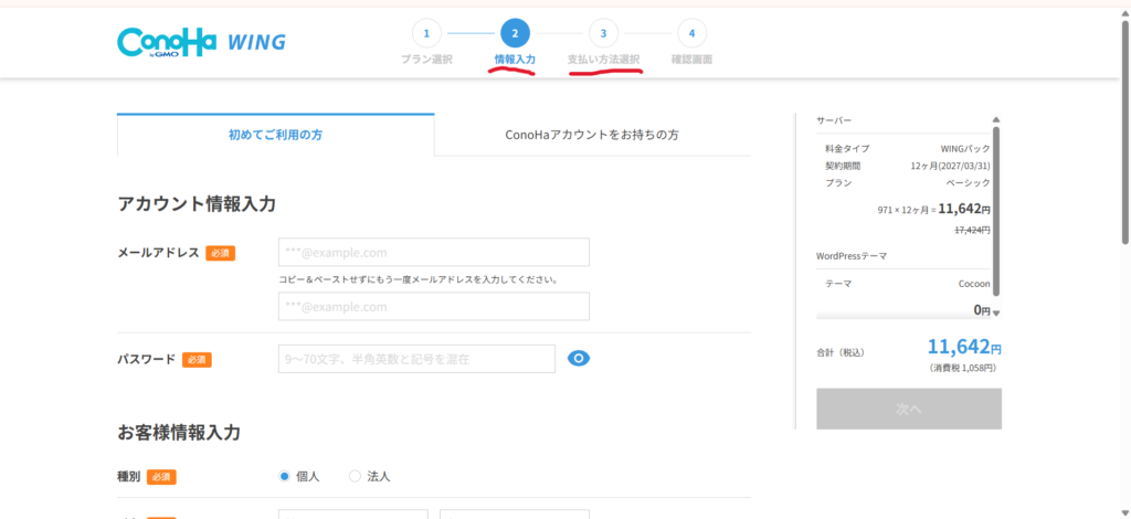 次の画面に進むと、個人情報の入力です。